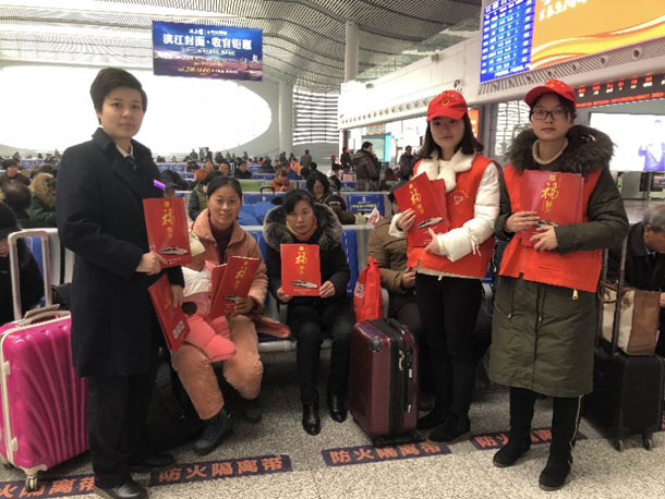 2月10日,正值春节返城高峰,市火车站内人山人海。数名头戴小红帽、身穿红马甲的年轻身影,在人群中显得格外醒目。他们有的帮助旅客拎行李,有的指导旅客取票买票,有的向旅客赠送春联。他们就是市建投公司的志愿者们。
