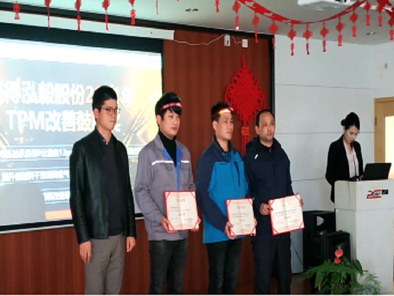 经评选,大连嘉翔“智能制造——油压机自动上下料单元”改善、芜湖普威“降低车身件焊点毛刺”改善、博耐尔“提升M1A冷凝器外观一次出炉合格率”改善分别荣获一二三等奖。杰诺瑞“发电机轴承压伤0公里由13ppm降低至0ppm”改善、泓鹄材料“提升模型烘干效果降低气孔发生率”改善和金安世腾“安全带拉脱”改善获得鼓励奖。大连嘉翔张毅荣获泓毅股份“2021年度TPM推行优秀管理者”称号,杰诺瑞荣获泓毅股份“2021年度TPM推行管理A级单位”称号。随后,对获奖者/获奖单位举行了隆重的颁奖仪式,并邀请获奖代表上台发言。