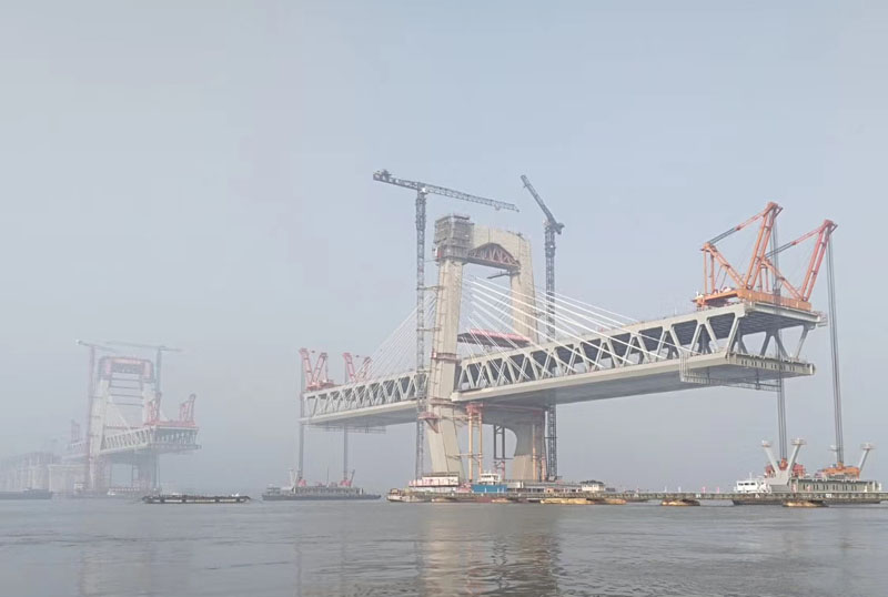 截止目前,主桥钢梁已完成43节(共88个节间),斜拉索已安装128根(共304根)。